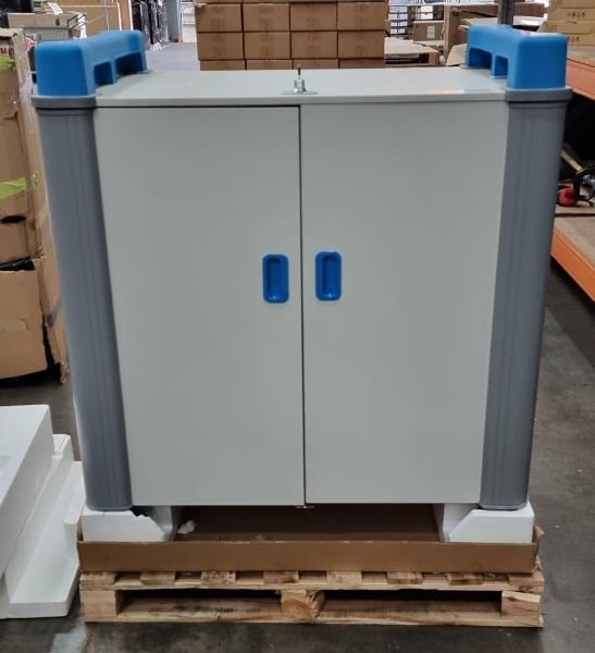 The LapCabby 32 Vertical' charges 32 devices up to 17" screen size laptops and Chromebooks including protective cases. Sliding shelves store devices vertically with dividers and specially moulded rubber mats hold devices in place. Cable management clips protect lose cables from damage. The LapCabby offers fast, flexible and simultaneous charging with a programmable timer. Maximum security & safety with dual point locking system and separate lockable power compartment. Easy to move with ergonomic top handles, rounded corner bumpers and multi-directional non-marking wheels. The built-in heat sensor shuts down the unit if over-heating occurs. The lock has been replaced on this model.